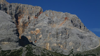 By now I 'd climbed through the layer of overcast and into crystal blue sky. This place has about the biggest spread of bright green meadows I've ever seen. These are surrounded by lovely peaks, foremost among them La Croda Rossa (3146m). It has very striking veins of blood red stone on its cliff faces. I first noticed it last year from Tre Cime di Lavaredo, and then again a few weeks ago on the road from Dobbiaco to Cortina.
